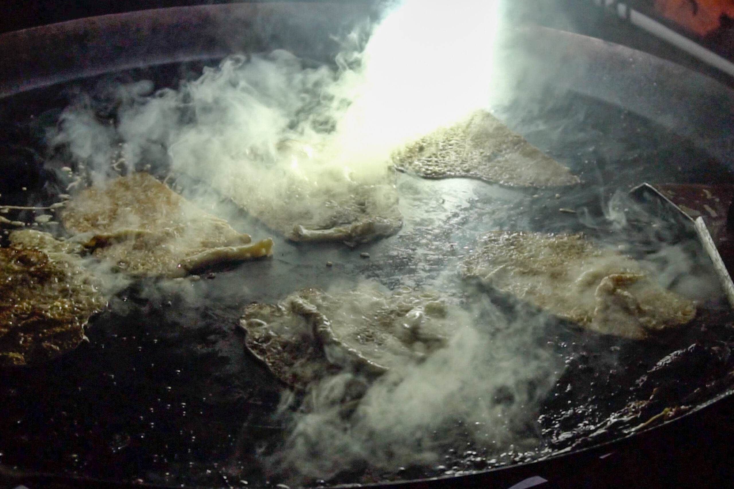 Lättyjä paistamassa pannulla ulkotapahtumassa